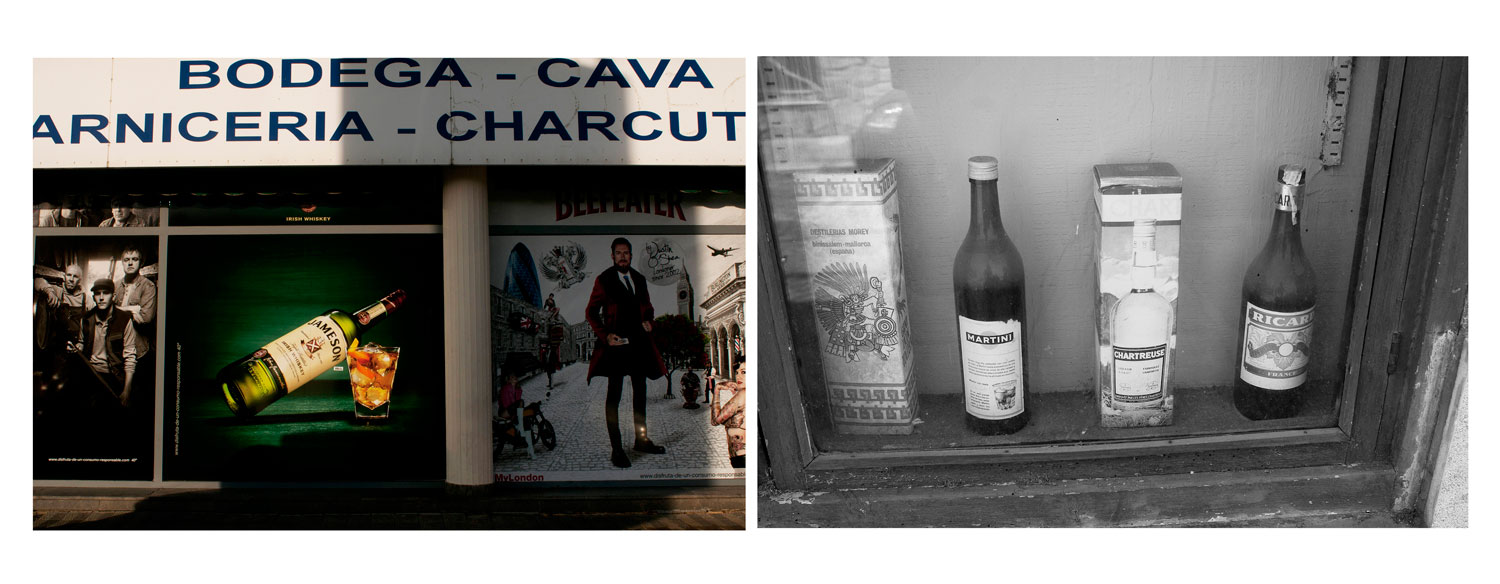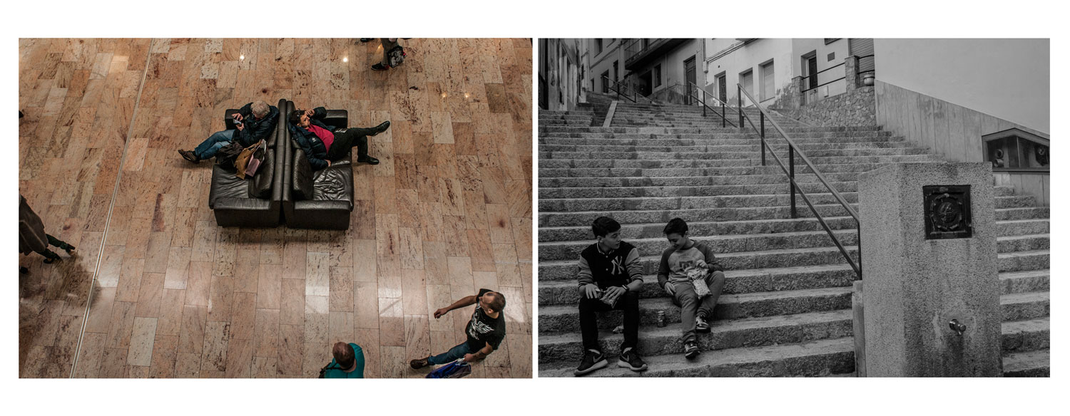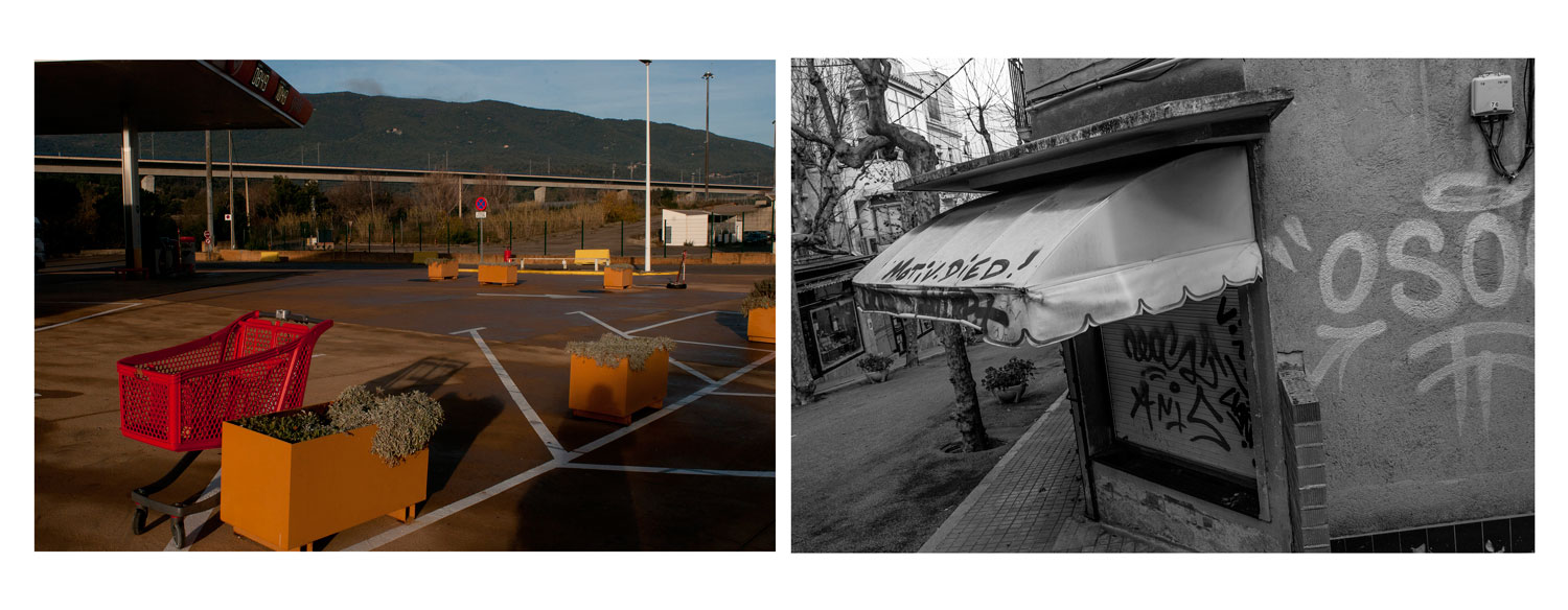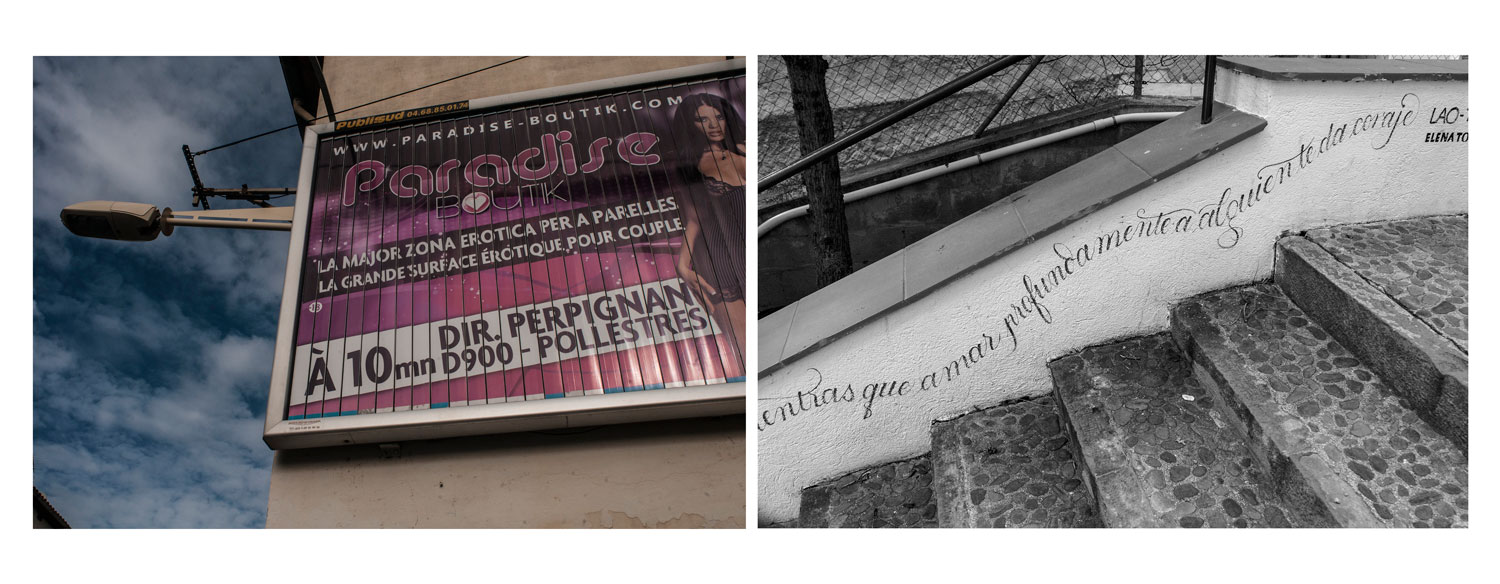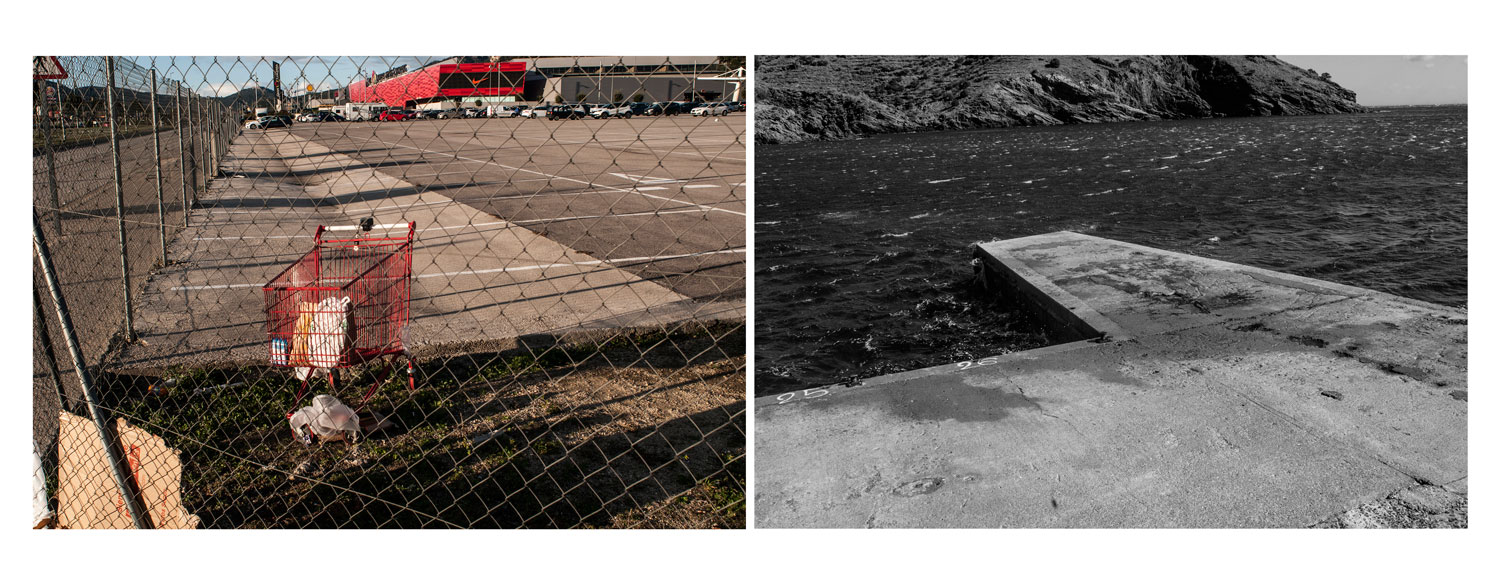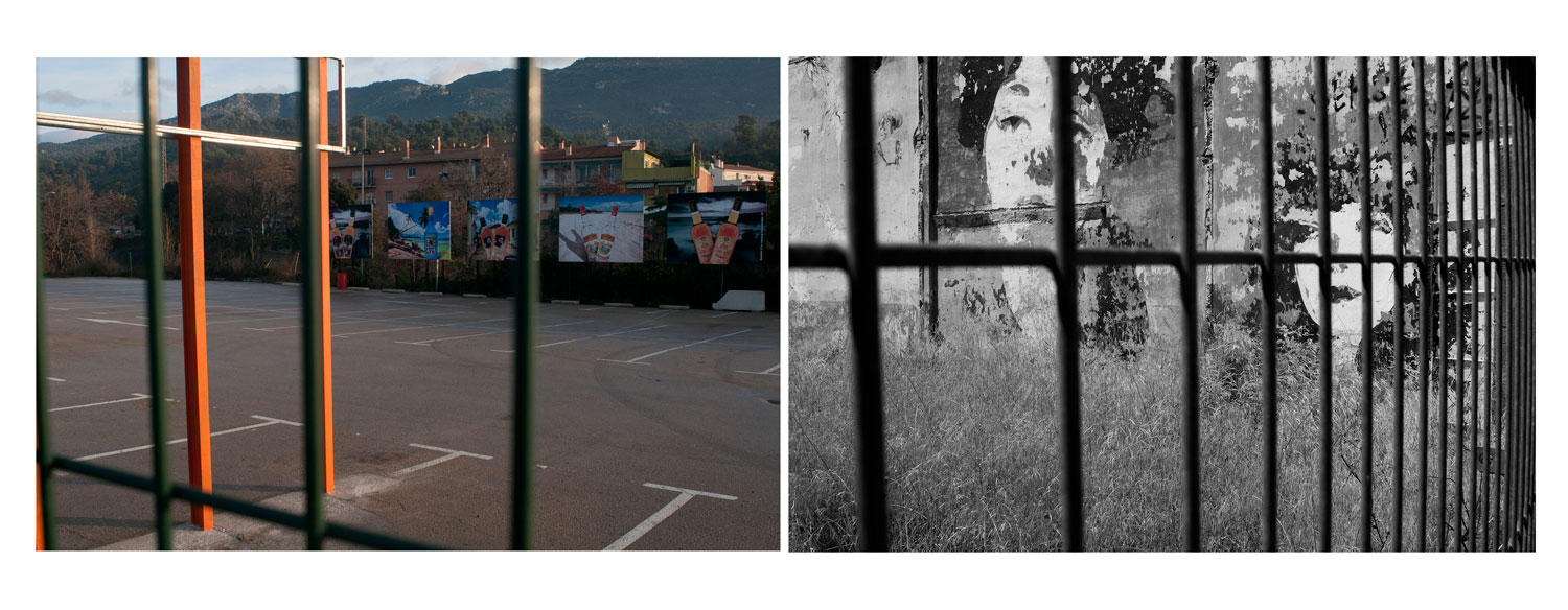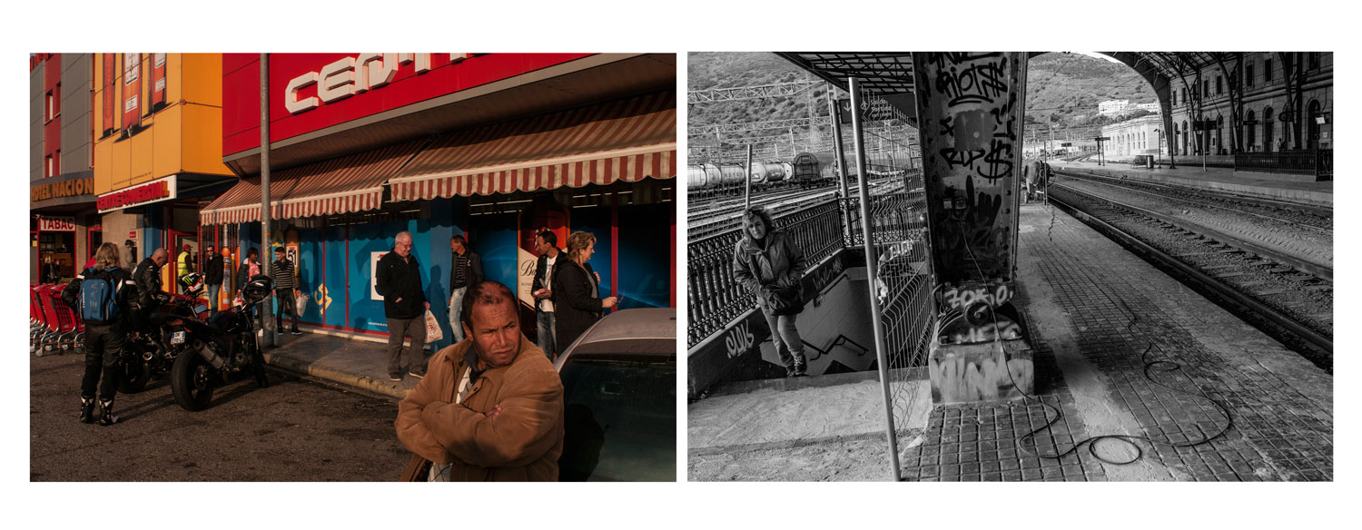 The images are presented in diptychs: in color (La Jonquera) and in black and white (Portbou)
